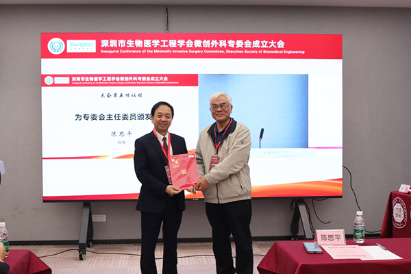 选举结果宣布后,深圳大学医学部生物医学工程学科创始人陈思平教授为专委会授牌,为主任委员颁发聘任证书。